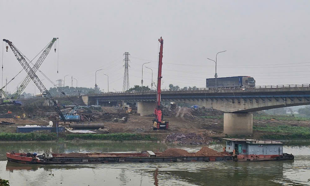 Nhà thầu bố trí máy móc khởi công công trình mở rộng cầu Xương Giang và đường dẫn hai đầu cầu. Ảnh chụp sáng 24/2. |